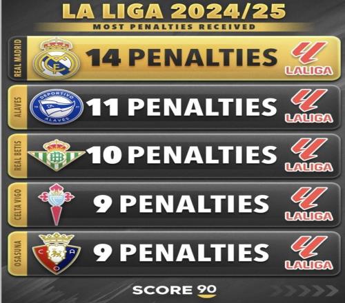 2024/25:皇家馬德里14、阿拉維斯11、皇家貝蒂斯10、塞爾塔9、奧薩蘇納9
