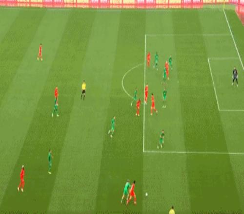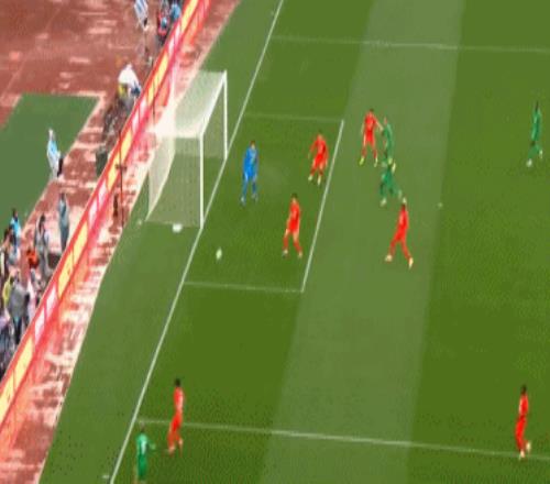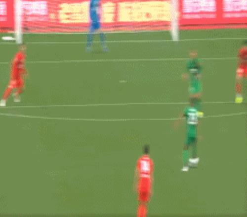 第29分鐘,楊希右路橫傳,安永佳將球一擋,達(dá)萬大腳解圍,球打在恩科洛洛身上反彈擊中門柱,國安逃過一劫。