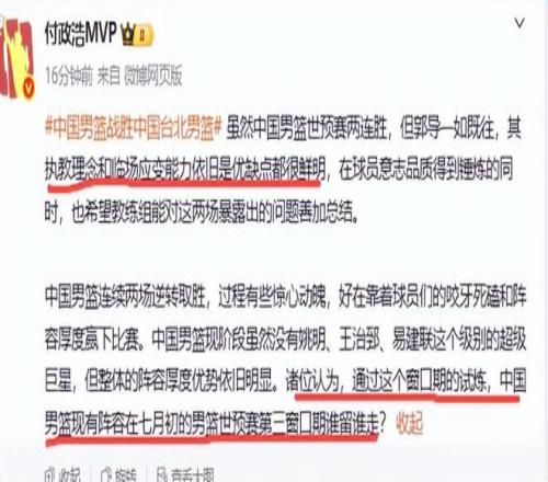 賽后名記付政浩對(duì)比賽有些不滿,他表示,“雖然中國男籃世預(yù)賽兩連勝,但郭導(dǎo)一如既往,其執(zhí)教理念和臨場應(yīng)變能力依舊是優(yōu)缺點(diǎn)都很鮮明,在球員意志品質(zhì)得到錘煉的同時(shí),也希望教練組能對(duì)這兩場暴露出的問題善加總結(jié)?!彼€說,通過這個(gè)窗口期的試煉,中國男籃現(xiàn)有陣容在七月初的男籃世預(yù)賽第三窗口期誰留誰走?