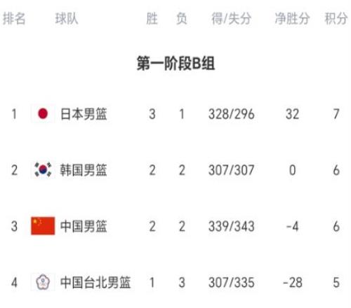 B組四輪過后,日本隊3勝1負穩(wěn)居第一,韓國隊、中國隊都是2勝2負,中國隊凈勝分落后4分,仍然排名第三,中國臺北隊1勝3負穩(wěn)居墊底。盡管排名沒有變化,但晉級形勢再度有變,中國隊形勢柳暗花明。
