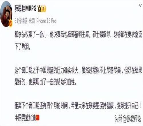 薛思佳寫道:“和李弘權(quán)聊了一會(huì)兒,他說(shuō)賽后包括郭振明主席、郭士強(qiáng)指導(dǎo)、趙睿都在更衣室流下了熱淚?!?/p>