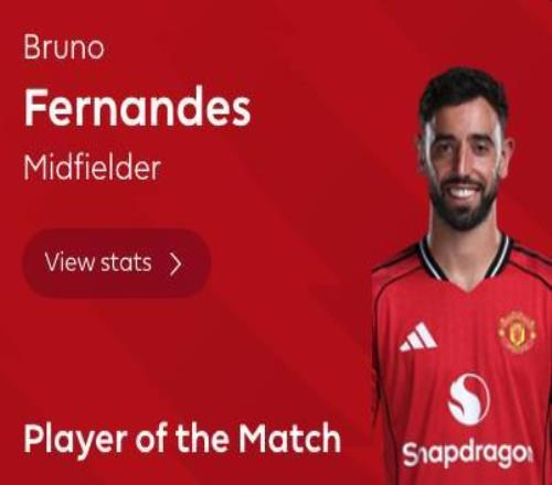 最終經(jīng)過英超官網(wǎng)球迷投票,布魯諾-費爾南德斯以81%的得票率當(dāng)選全場最佳球員。