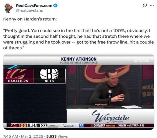 按照這類骨折正常休養(yǎng)4-6場(chǎng)來計(jì)算,僅休戰(zhàn)2場(chǎng)的哈登本場(chǎng)顯然是提前復(fù)出,上半場(chǎng)狀態(tài)也有些不佳,好在下半場(chǎng)哈登逐漸找回狀態(tài),最終騎士106-102逆轉(zhuǎn)擊敗籃網(wǎng)結(jié)束2連敗。