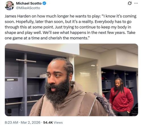 盡管狀態(tài)不俗,但已經(jīng)年滿36歲的哈登賽后還是難免被問到退役問題,哈登公開表示:“我知道離退役的日子越來越近了,希望這一天能晚一些,自己會(huì)努力保持身體狀態(tài),一場(chǎng)一場(chǎng)地打,珍惜當(dāng)下的每一刻?!?/p>