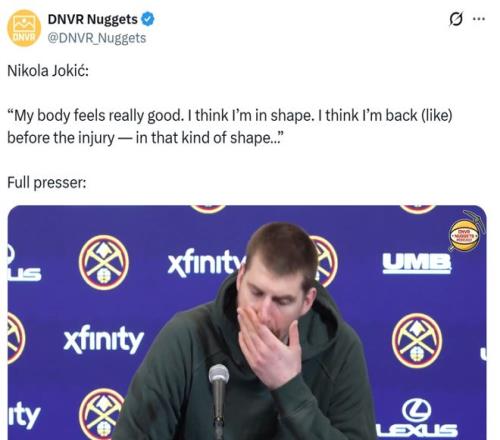 好在約基奇狀態(tài)明顯正在回暖,賽后約基奇表示自己的身體感覺(jué)非常好,正在恢復(fù)到受傷前的那種狀態(tài)。