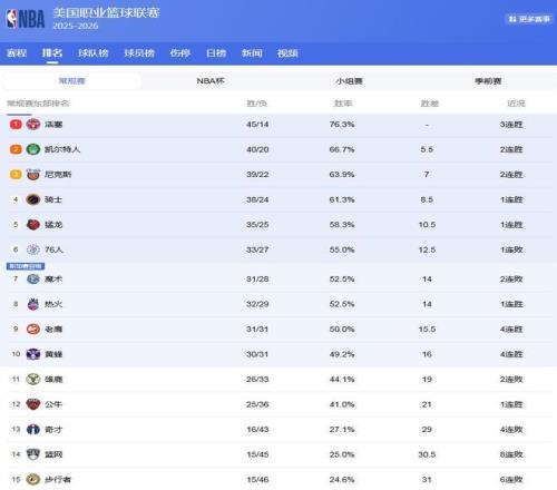 東部相對來說,競爭壓力更大!活塞隊一枝獨秀,45勝14負,領先第2的綠軍5.5場勝負差,基本上坐穩(wěn)了東部第1的位置!綠軍40勝20負,領先第3的尼克斯1.5場,第2的席位還有懸念,而騎士隊,試圖沖擊第3名!