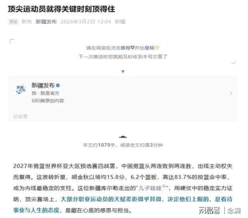 這篇文章的題目是《頂尖運(yùn)動(dòng)員就得關(guān)鍵時(shí)刻頂?shù)米 罚倜绞①潄?lái)自新疆庫(kù)爾勒的“兒子娃娃”胡金秋,用硬仗中的穩(wěn)定實(shí)力證明,在頂尖賽場(chǎng)上,大部分職業(yè)運(yùn)動(dòng)員的天賦差距微乎其微,決定他們上限的是看待事業(yè)與人生的態(tài)度,是藏在心底的感恩與擔(dān)當(dāng)。