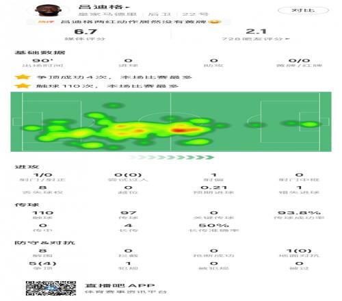 本場比賽呂迪格為皇馬首發(fā)踢滿全場,并獲得6.7分的評分。