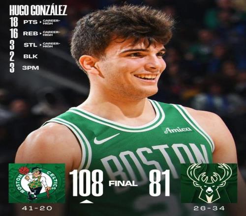 這場比賽,杰倫布朗缺席,新秀雨果-岡薩雷斯頂上了首發(fā),然后打出了生涯之夜:全場出戰(zhàn)35分鐘,投籃15中7,三分8中3,罰球3中1,得到18分16籃板3搶斷2蓋帽1助攻。