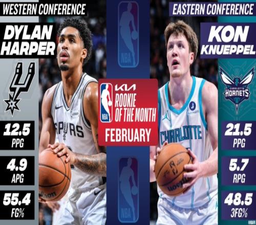 體育播報(bào)3月4日宣 今天NBA官方公布了2月份月最佳新秀,西部馬刺新秀哈珀、東部黃蜂新秀克尼佩爾當(dāng)選。