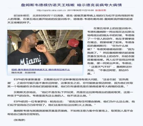 在G4賽后,小牛主教練里克-卡萊爾在面對采訪的時候,無意中說到諾維斯基高燒39度,但仍然堅持打完比賽并且在比賽最后關(guān)頭投進關(guān)鍵球。作為球迷,聽到這番話,只能夠感受到職業(yè)球員為爭取榮譽,突破自身極限的競技體育精神,但是在韋德和詹姆斯那里,這卻成為了嘲諷諾維斯基的理由。