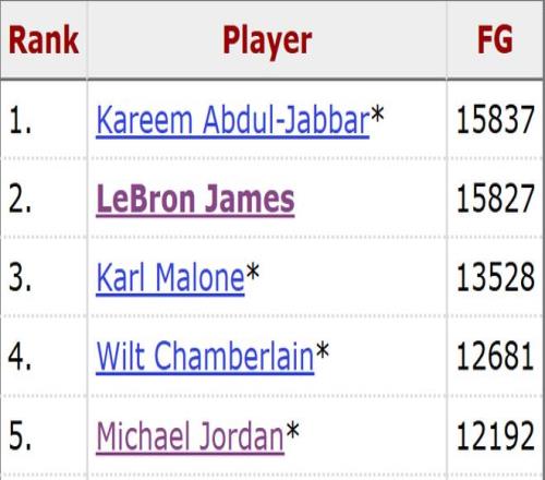 常規(guī)賽生涯至今,詹姆斯已經(jīng)命中15827個球,排名歷史第二,而排名第一的賈巴爾累計命中15837球,換言之,詹姆斯再進11個球就將超越天勾,成為該項數(shù)據(jù)的NBA歷史第一。