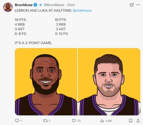 上半場(chǎng)打完詹姆斯8中6,三分3中1,拿到16分4籃板3助攻;東契奇半場(chǎng)13中6拿到16分3籃板3助攻。上半場(chǎng)打完湖人領(lǐng)先2分。