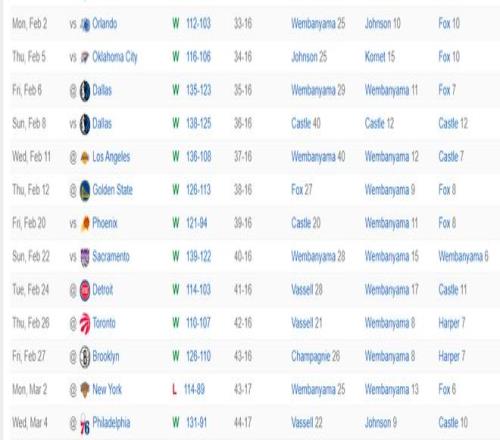 這場(chǎng)比賽后馬刺隊(duì)最近的13場(chǎng)比賽贏下了其中的12場(chǎng),雷霆、魔術(shù)、湖人、太陽(yáng)、勇士、活塞、猛龍、費(fèi)城都是強(qiáng)隊(duì),馬刺這一波的含金量很高。