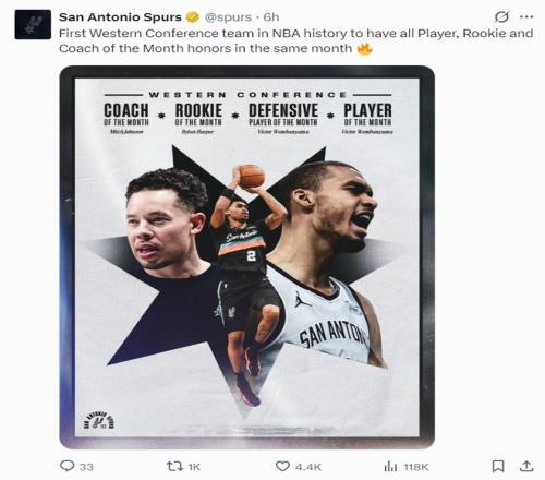 近13戰(zhàn)12勝!馬刺8人上雙狂勝40分太猛哈珀冒頭奪冠賠率已升第三
