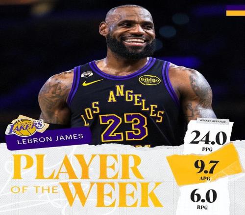 詹姆斯當(dāng)選常規(guī)賽最后一周西部周最佳球員,他場均貢獻(xiàn)24.0分、9.7次助攻和6.0個籃板,帶領(lǐng)球隊(duì)在缺少另外兩大核心的情況下拿下勝績。