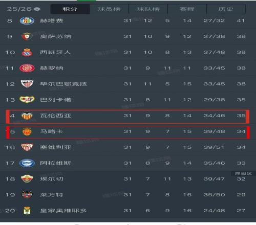 馬洛卡名副其實(shí)的“主場龍”,目前球隊(duì)聯(lián)賽排名第15,積34分,僅與今天的對手瓦倫西亞相差一分。而兩隊(duì)僅與降級區(qū)相差一個勝場,這場比賽是實(shí)打?qū)嵉摹氨<?分戰(zhàn)”。