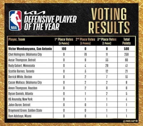按照規(guī)則,DPOY由美國(guó)和加拿大的體育記者及電視評(píng)論員投票評(píng)選,每張選票可填寫(xiě)三個(gè)球員,首選票5分、次選票3分、三選票1分,總分最高的球員當(dāng)選。這次全部的100張選票中,所有人都將文班亞馬列在了第一位,他也因此拿到了500分的滿(mǎn)分,成為NBA史上首位全票DPOY得主。在文班亞馬之前得分最高的是2001-02賽季的本·華萊士,他120張選票里拿了116張,還差4票沒(méi)能圓滿(mǎn)。