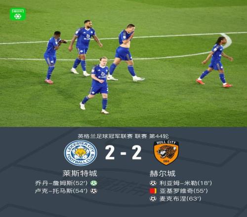 北京時間4月22日英格蘭足球冠軍聯(lián)賽 聯(lián)賽 第44輪,萊斯特城主場對陣赫爾城。萊斯特城喬丹-詹姆斯破門,盧克-托馬斯破門。赫爾城利亞姆-米勒破門,麥克布涅破門。最終比分萊斯特城 2-2 赫爾城。
